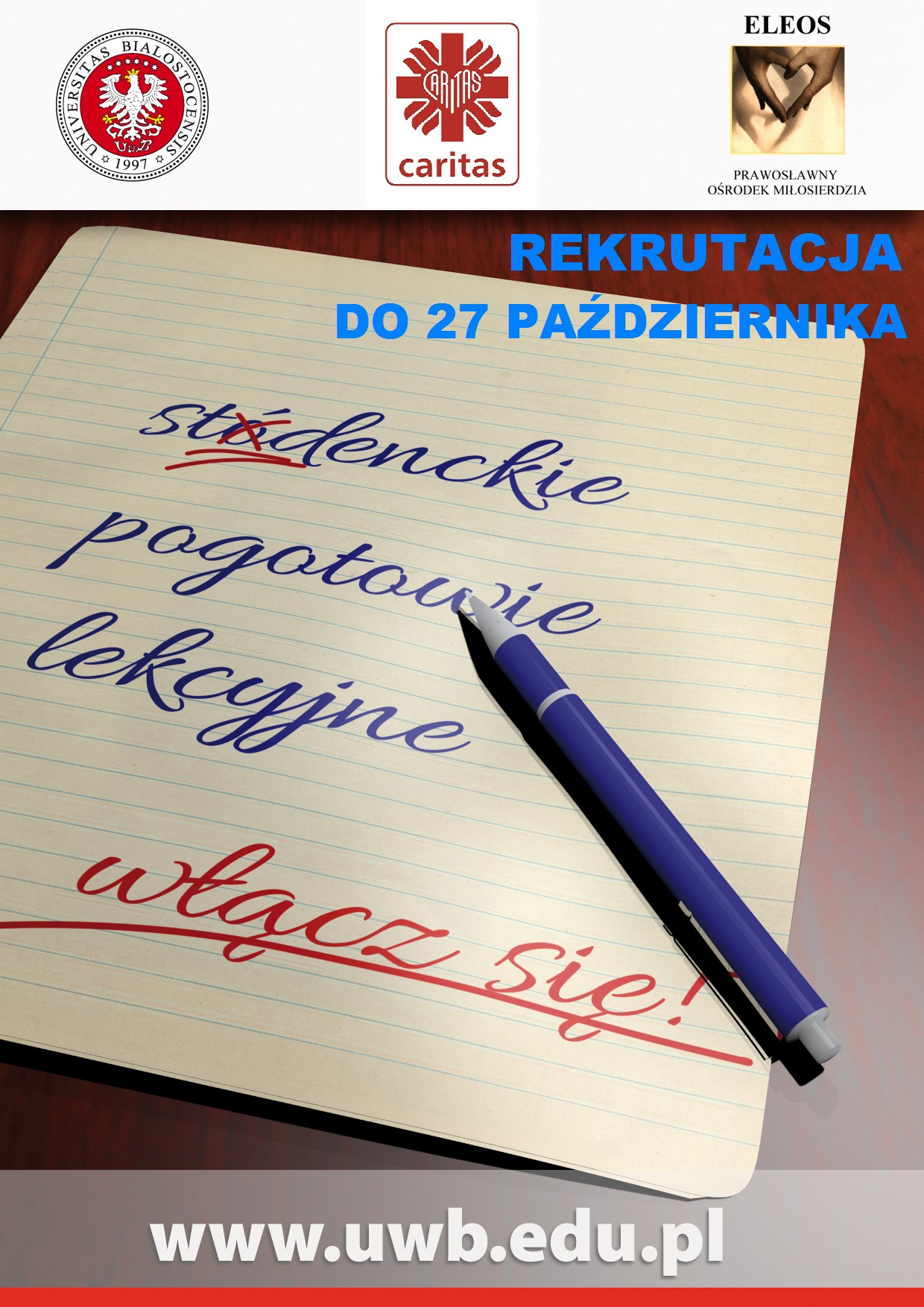 Chcesz podzielić się swoją wiedzą i czasem? Chcesz zdobyć cenne doświadczenie? Chcesz pomóc? Przyłącz się do kolejnego semestru akcji Studenckie Pogotowie Lekcyjne organizowanej przez Uniwersytet w Białymstoku we współpracy z organizacjami charytatywnymi! Czekamy na studentów wszystkich kierunków. Żacy spoza UwB także mile widziani.